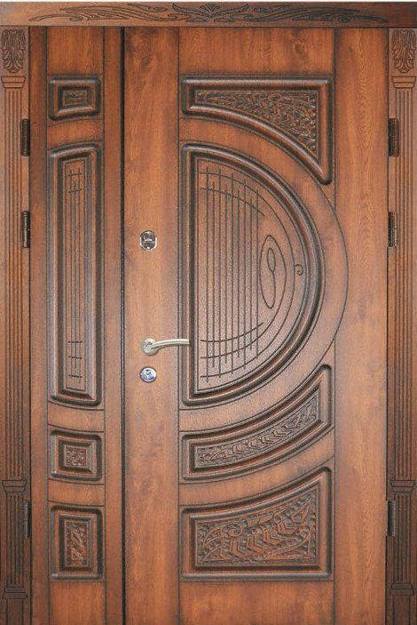 Поскольку в большинстве случаев устанавливаемые на входе в коттедж двустворчатые двери являются еще и предметом интерьера, украшающим здание, их дизайну предается особое значение. Эти двери, как правило, отделываются атмосферостойким МДФ, натуральным шпоном, массивом. Эффектно на таких дверях смотрится витражный узор, применение ковки, зеркальных элементов. Вариантов декора входной двустворчатой двери масса, тут все зависит от пожеланий заказчика.